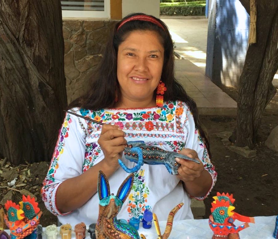 Blanca grew up down the road from the Fabians in San Martín Tilcajete, the small rural woodcarving community outside the city of Oaxaca. She learned her craft as a child painting for her family, and later found inspiration for her designs from her indigenous Zapotec ancestry.