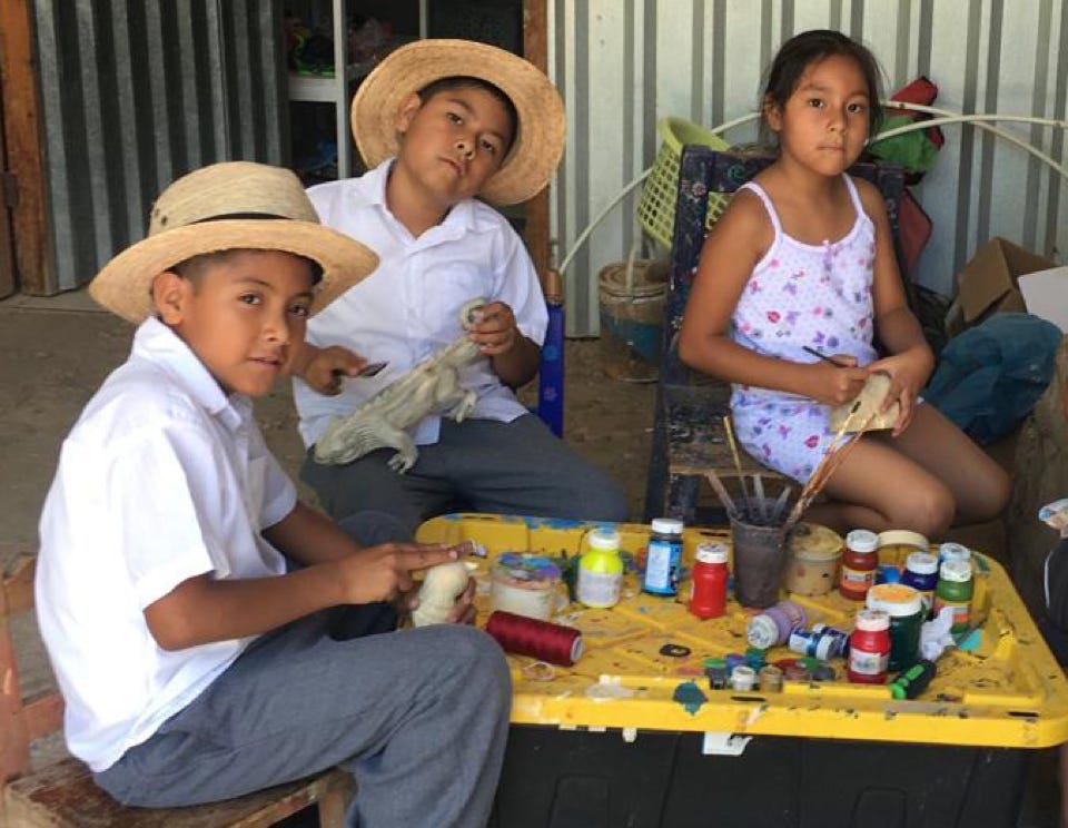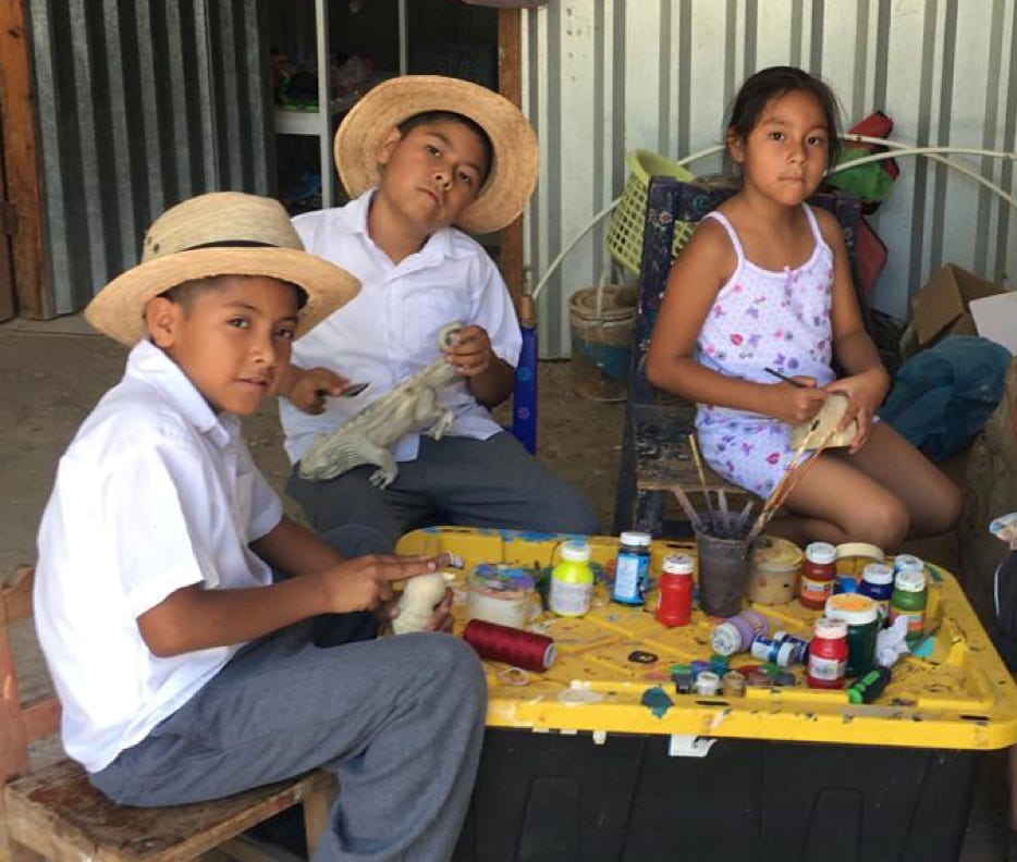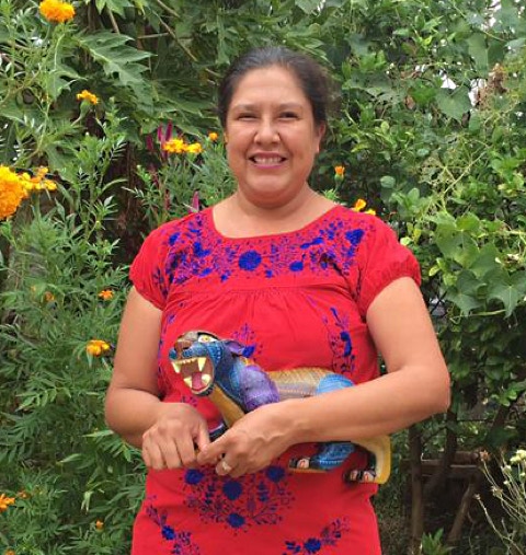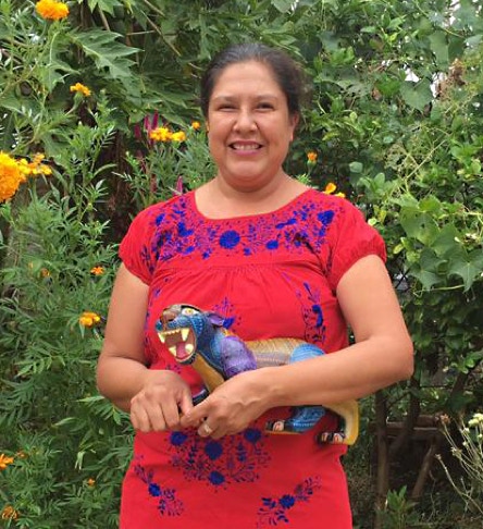 Blanca Estela Melchor Mendez, a skilled and meticulous painter, learned her craft at the age of 13, working in the studio of her uncle, another carver in this town of woodcarvers. She is grateful that their craft allows the family to work together and while doing that, her children can absorb the process of creating art.